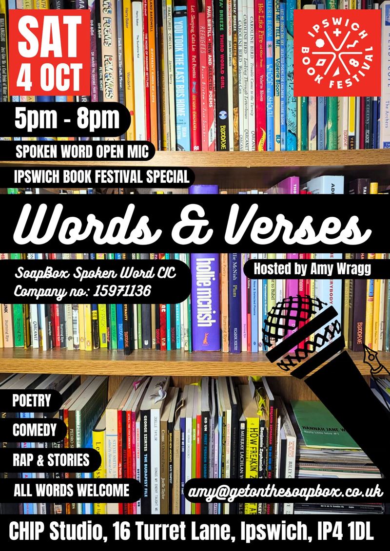 Join SoapBox for a very special edition of Words & Verses, as part of the glorious, inaugural edition of the Ipswich Book Festival.
