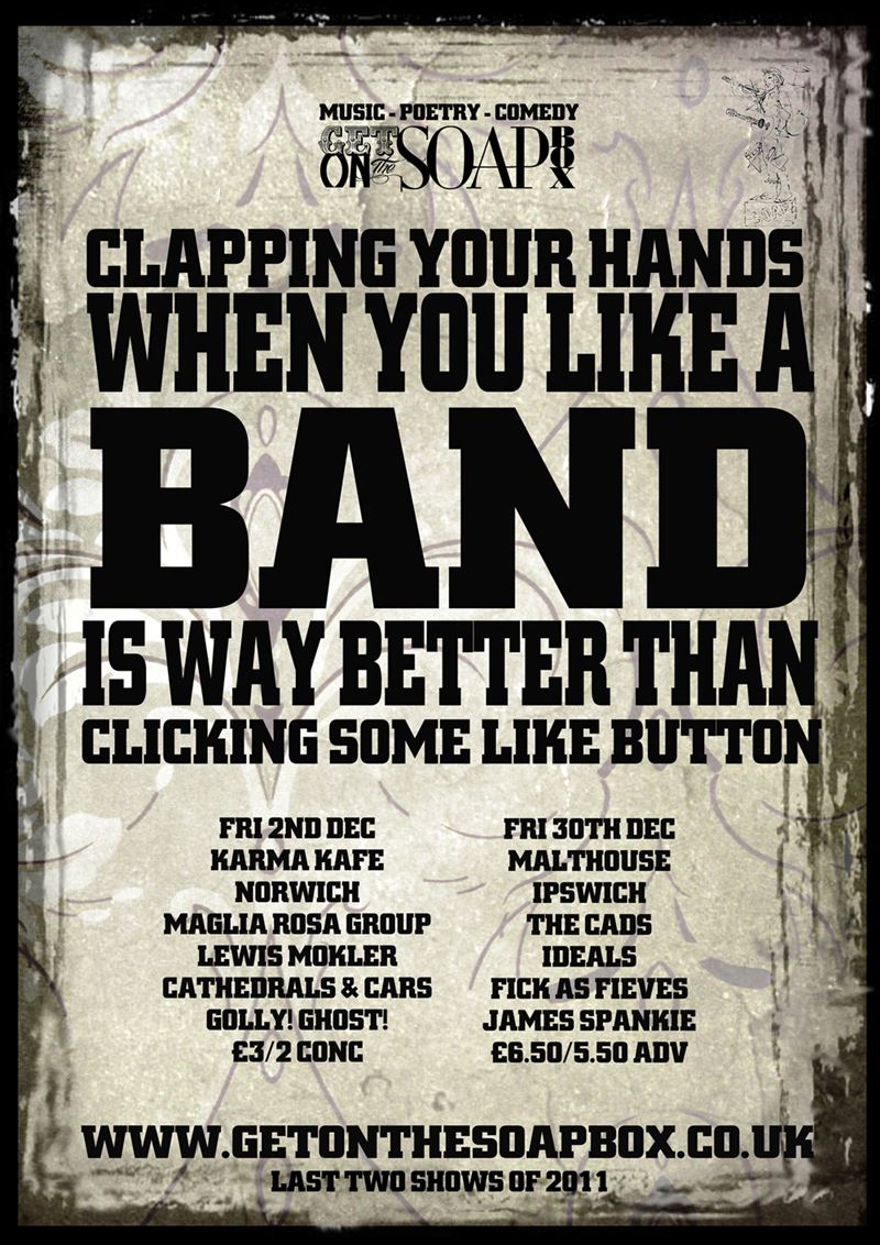 Today we announced our last two shows of 2011 and its proper exciting. We hope very much you can join us at either (or both) of our Christmas shows in Norwich & Ipswich. We have some amazing bands, musicians, poets and comedians we just know you are gunna love. We have been searching the UK and East Anglia high and low to find you the very best original musicians for two unforgettable nights. I'm particularly pleased to welcome Maglia Rosa Group, Cathedrals & Cars, Lewis Mokler, Golly! Ghost!, The Cads, Ideals, Fick As Fieves and James Spankie to the SoapBox family for the first time.
