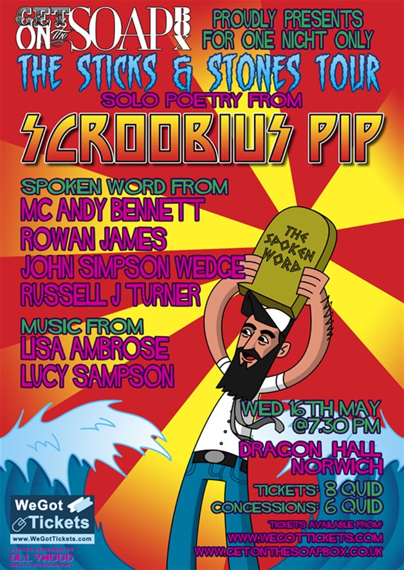 Now off to get ready for a massive sell out show at Dragon Hall with the Sticks & Stones tour featuring our very special guest Scroobius Pip. So freakin excited for this, just guna be immense. Been so long since I have seen this talented poet perform solo spoken word set. Guna love it! As well as our brilliant line-up of local musicians Lucy Sampson, Lisa Ambrose and Freya Roy, alongside 4 killer poets and comedians, MC Andy Bennett, John Simpson Wedge, Russell J Turner and Rowan James.