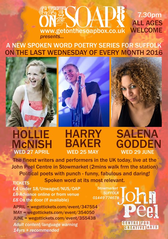 In April 2016 we launched a regular spoken word at the John Peel Centre in Stowmarket, on the last Wednesday of the month. It was set-up to bring the most exciting voices in contemporary poetry to Suffolk every month, in a high quality venue, with two local poets and one musician in support. Suffolk often gets over-looked when artists tour so we wanted to create an event that could bring them to this area. SoapBox has long been excited by spoken word and performance poetry, and it is this artform we celebrate here. The gig always features a diverse range of performers and poems, from the silly to the sublime, and welcomes all ages to the venue. Although we do suggest 14+ and say that there will most certainly be language of an adult nature.