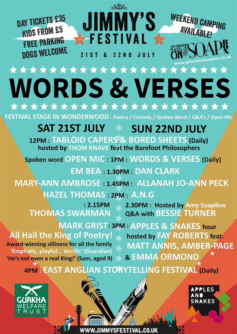 Pleased to announce the line-up for our live literature stage at Jimmy's Festival 2018. A handmade stage in the woods, featuring poetry, comedy, open mic, discussion panels and Q&A's, with a whole host of incredible wordsmiths and artists. Starting at midday each day with a daily news digest: Tabloid Capers and Bored Sheets, hosted by poet Thom Knave, and featuring the crew from the new podcast 'Barefoot Philosophers' - Jared Tilston and Matt Annis. There will also be a roaming mic for contrubutions from the audience. This promises to be a whole heap of fun. Check out the poster for full and finalised timings, and see you in the woods.