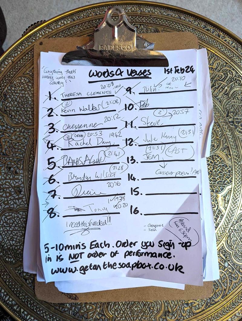 14 people shared their poems and stories and words with us, at the first event of 2024. The quality and breadth of topics, performances and content was remarkable. It really is a magical place, and it is the people who share their words on the mic that make it so. Audience members are much encouraged too, so you're very welcome to come along and listen. If you do want to perform, you can either turn-up on the night, or pop me an email is you would prefer to have your spot booked in advance. My email is amy@getonthesoapbox.co.uk