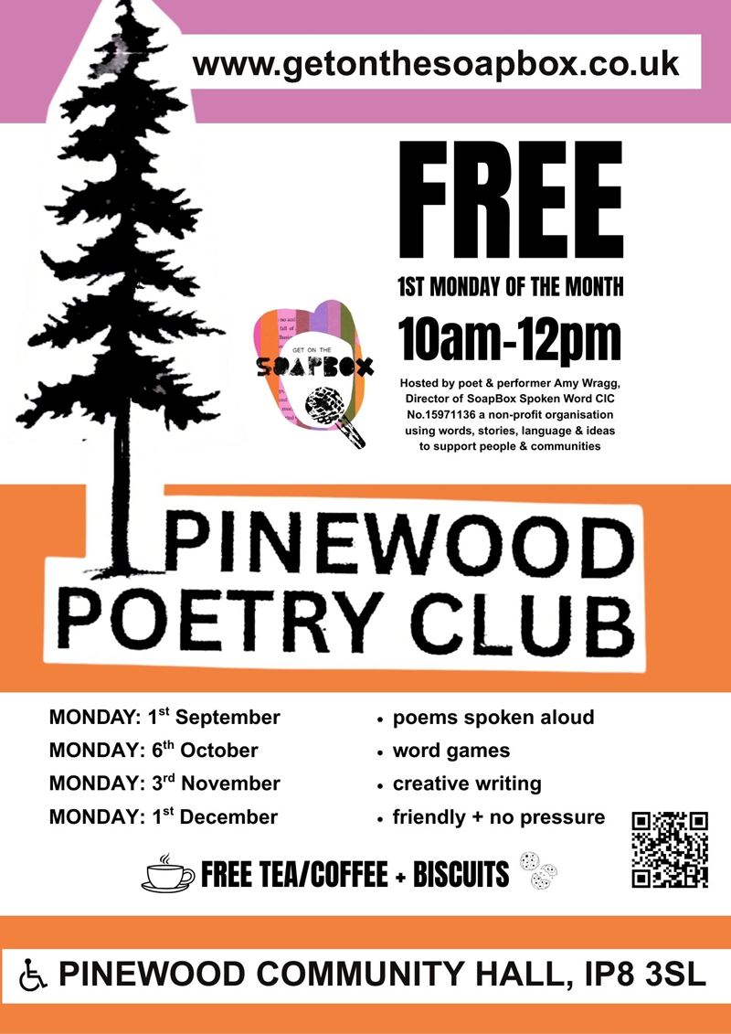 At each edition of the Pinewood Poetry Club we will share some poems, attempt some creative writing exercises, play word games, and talk about what poetry, words & language mean to us.